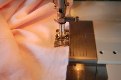 Line up the cut edge of the blanket about 3/8" away from the needle. Stitch (remember - without thread) all the way around the blanket.